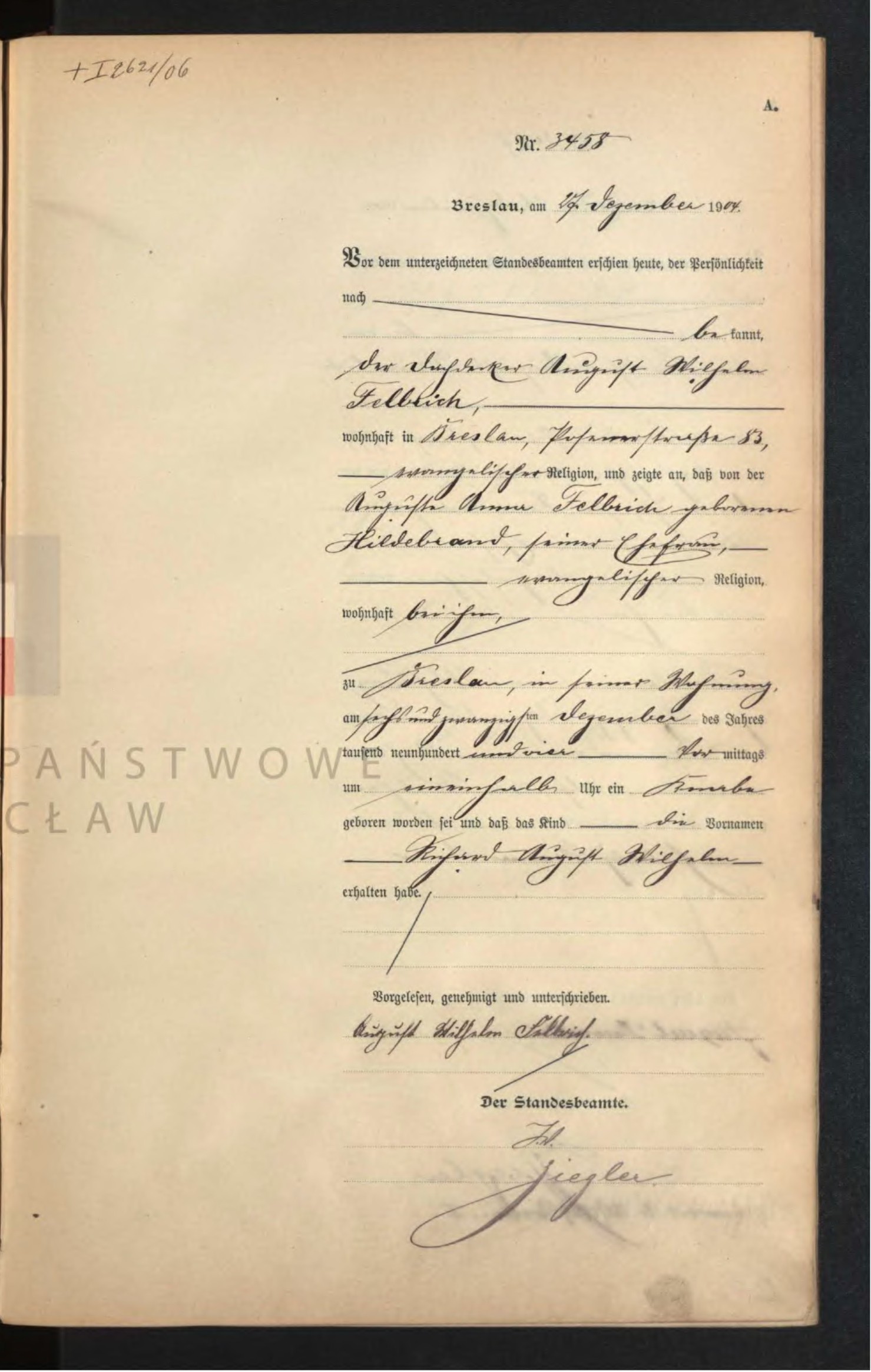 Breslau Standesamt Geburten, page 36526: Felbrich geb. Hildebrand Auguste Anna (null) Breslau Standesamt Geburten