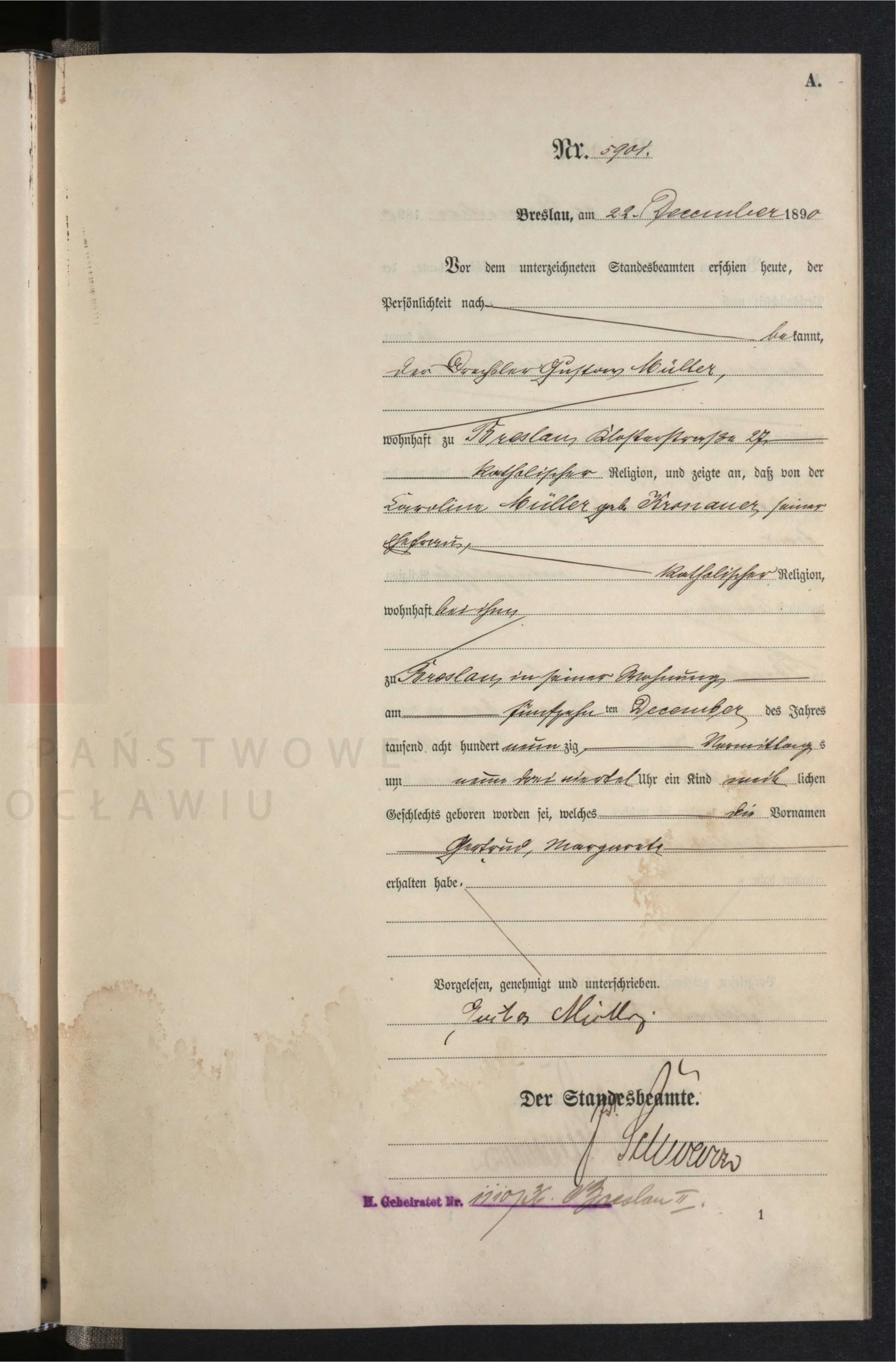 Breslau Standesamt Geburten, page 90-005901: Müller geb. Kronauer Caroline (null) Breslau Standesamt Geburten