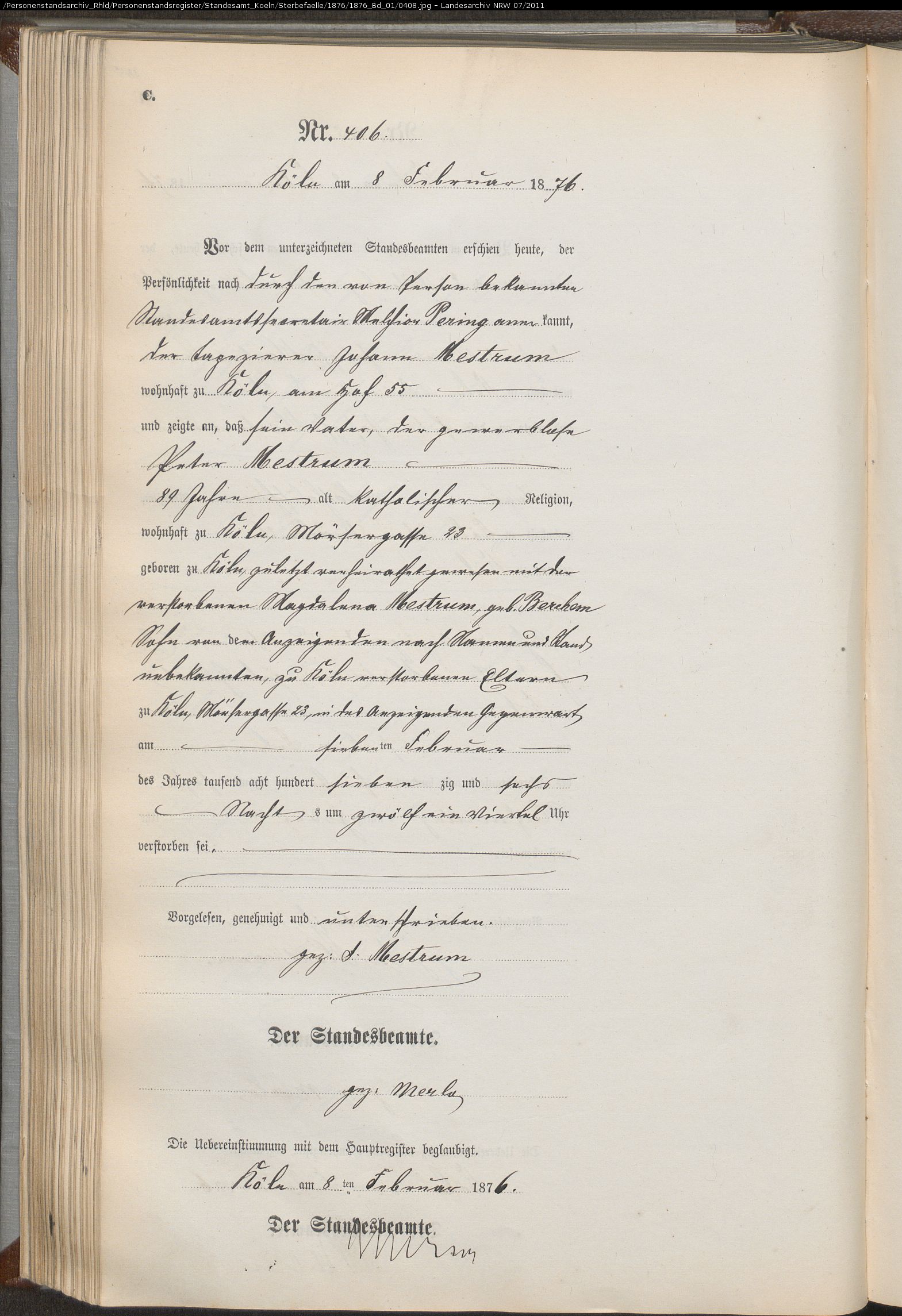 Köln Sterbeurkunden, page 1876-01-0408: Mestrum Johann (406) Köln Sterbeurkunden