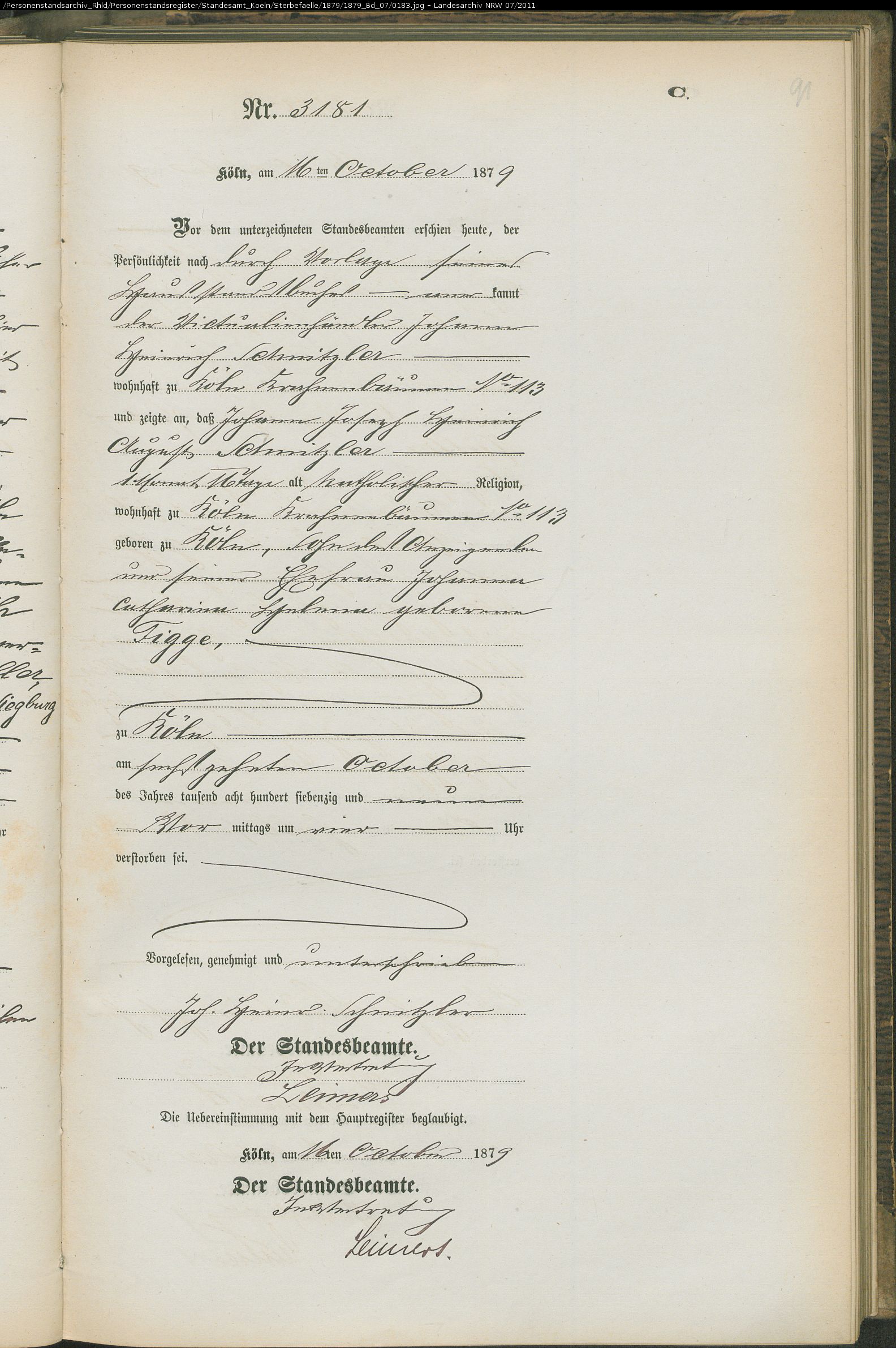 Köln Sterbeurkunden, page 1879-07-0183: Schnitzler Johann Joseph Heinrich August (3181) Köln Sterbeurkunden