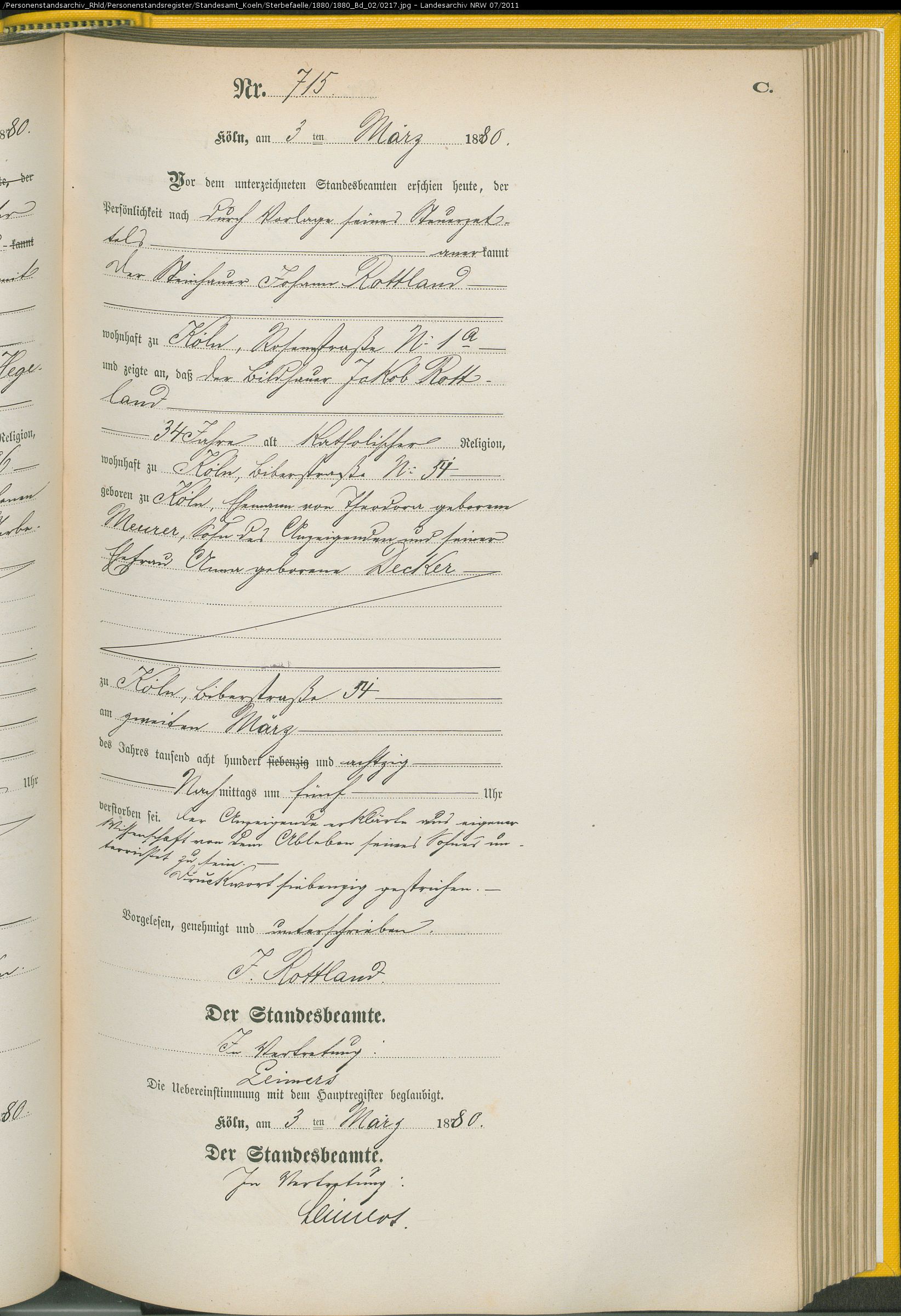 Köln Sterbeurkunden, page 1880-02-0217: Rottland geb. Meurer Theodora () Köln Sterbeurkunden