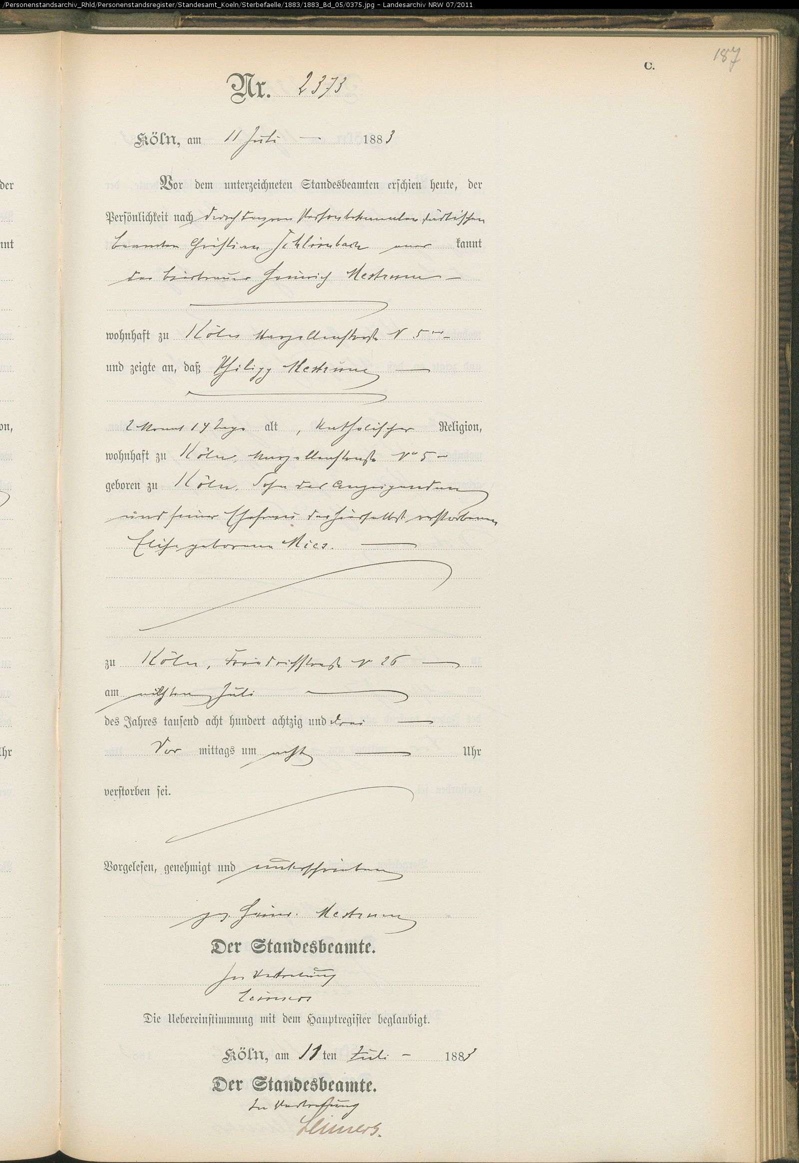 Köln Sterbeurkunden, page 1883-05-0375: Mestrum Philipp (2373) Köln Sterbeurkunden
