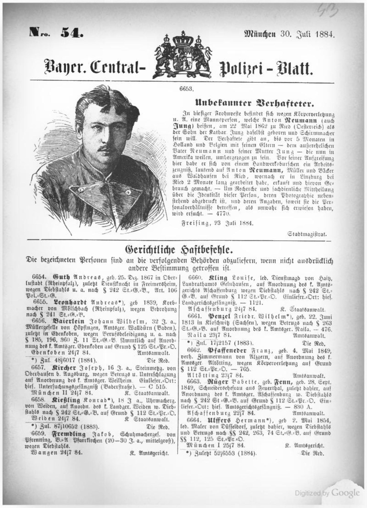 Bayer. Central-Polizei-Blätter ab 1872, page 1884-245: Rüger (geb. Fenn) Babette () Bayer. Central-Polizei-Blätter ab 1872