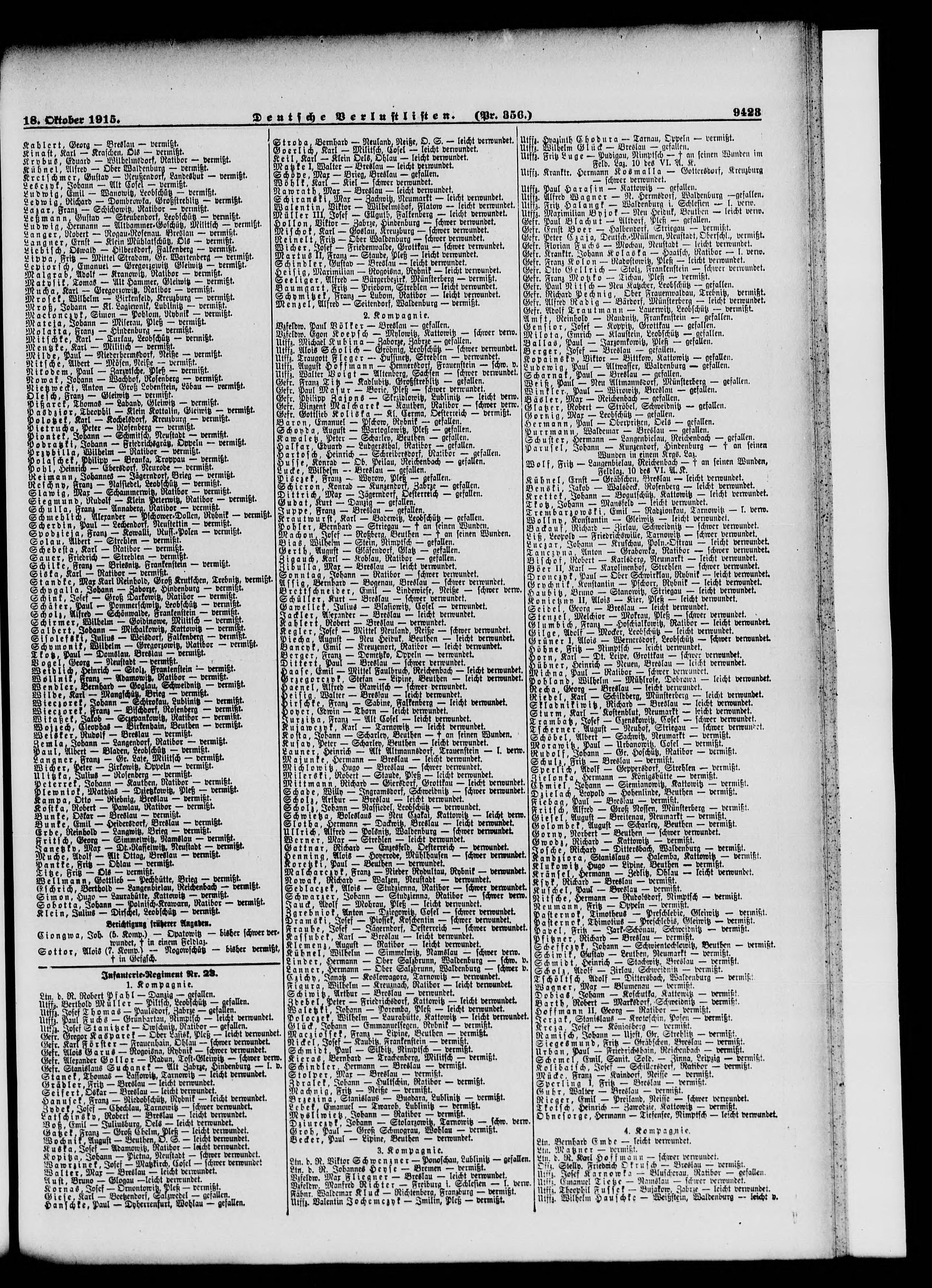 Verlustlisten 1. Weltkrieg, page 9423: Lebek Emanuel (Twaroh, Lublinitz) Verlustlisten 1. Weltkrieg
