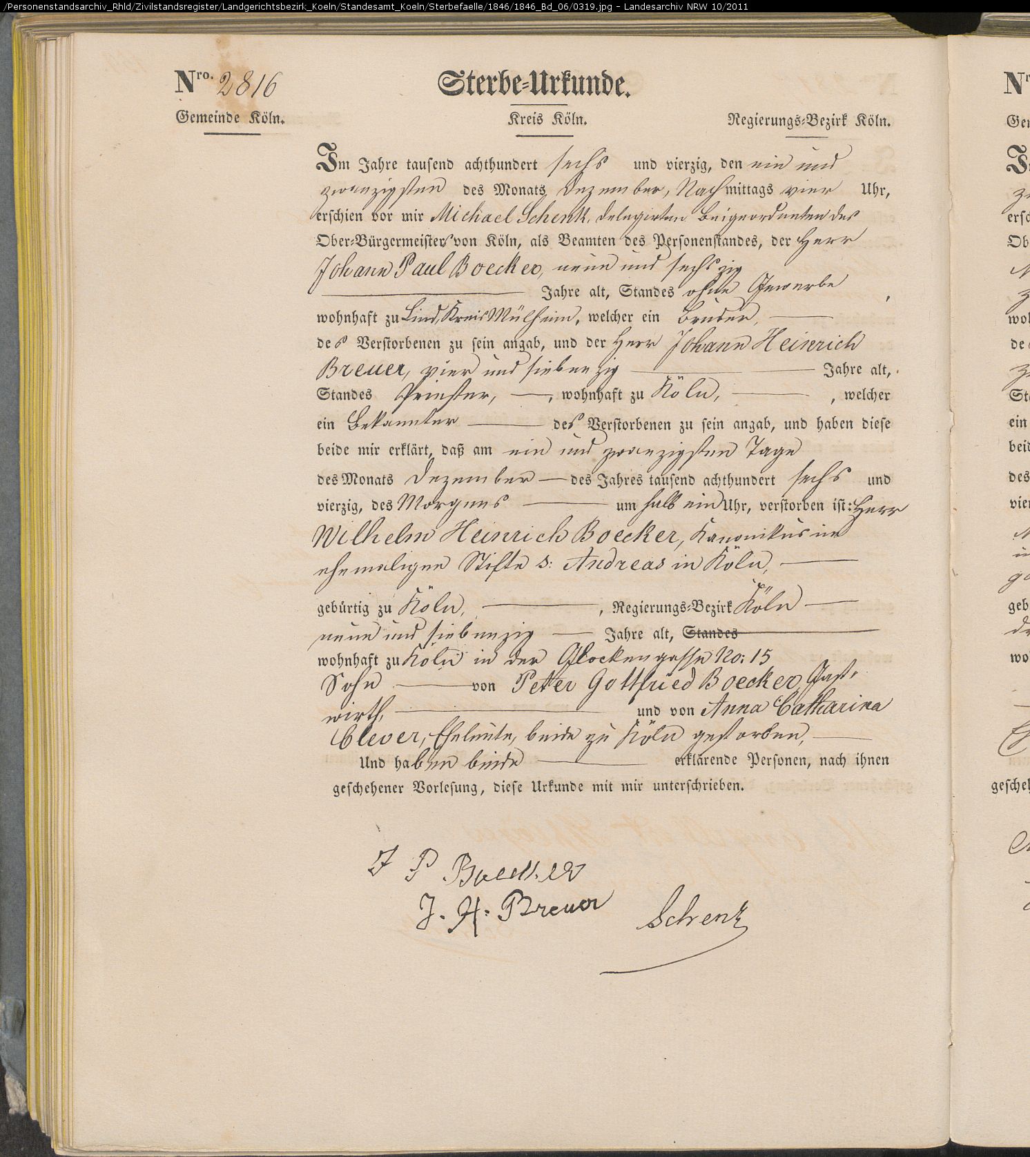 Köln Sterbeurkunden, page Land_1846_Bd_06_0319: Boecker Wilhelm Heinrich (2816) Köln Sterbeurkunden