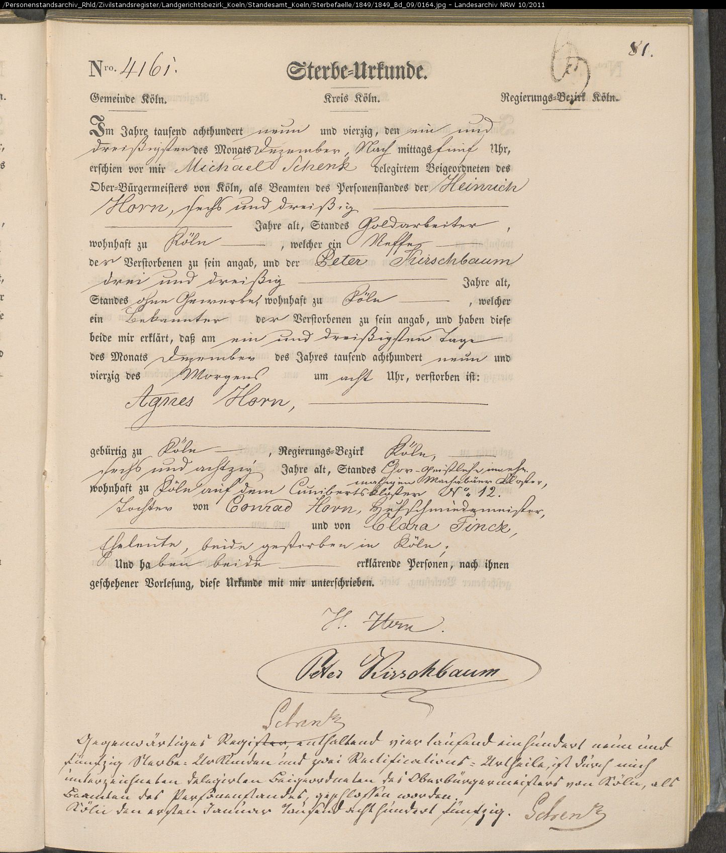Köln Sterbeurkunden, page Land_1849_Bd_09_0164: Horn Agnes (4161) Köln Sterbeurkunden
