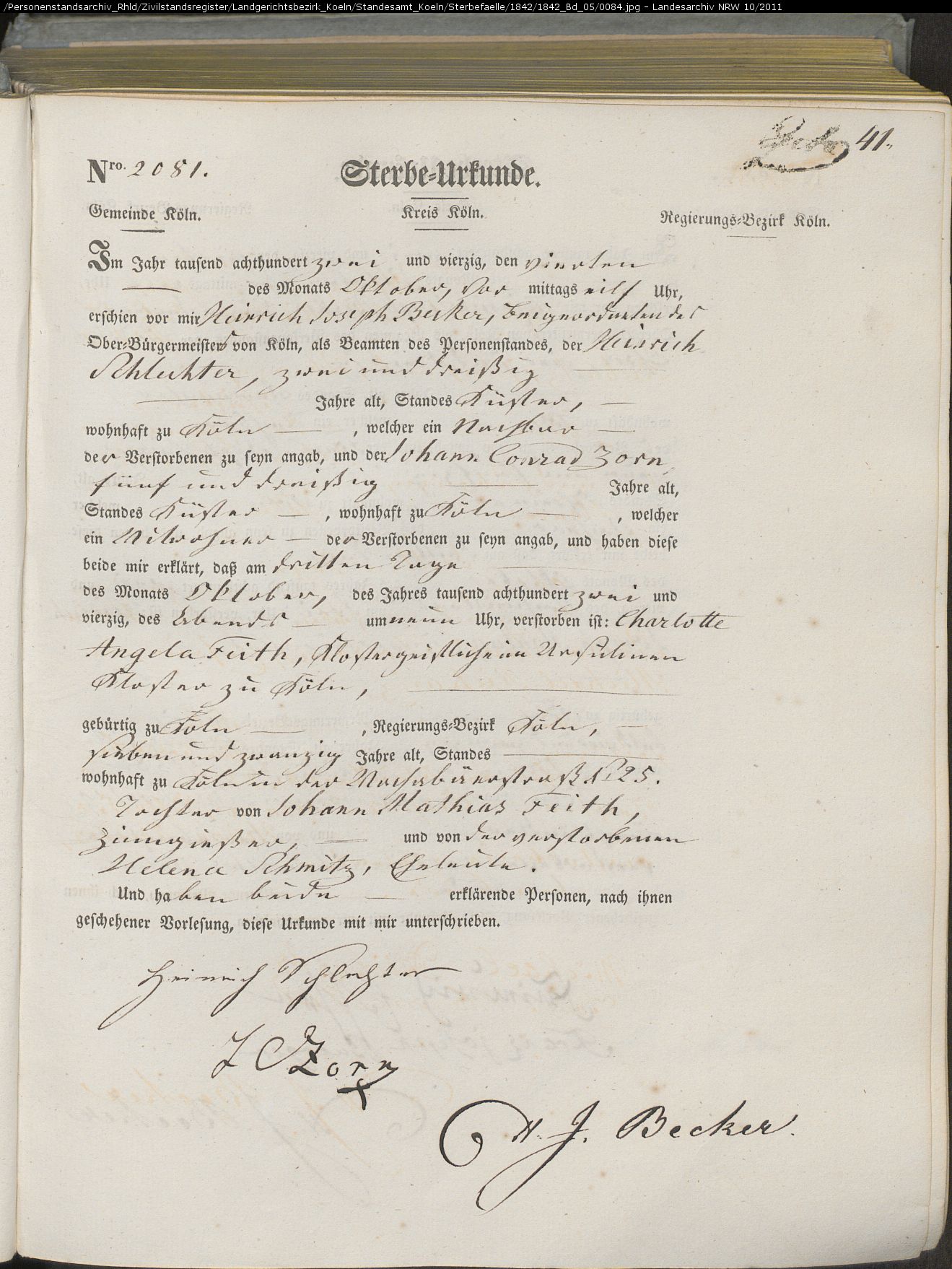 Köln Sterbeurkunden, page Land_1842_Bd_05_0084: Feith Charlotte Angela (2081) Köln Sterbeurkunden