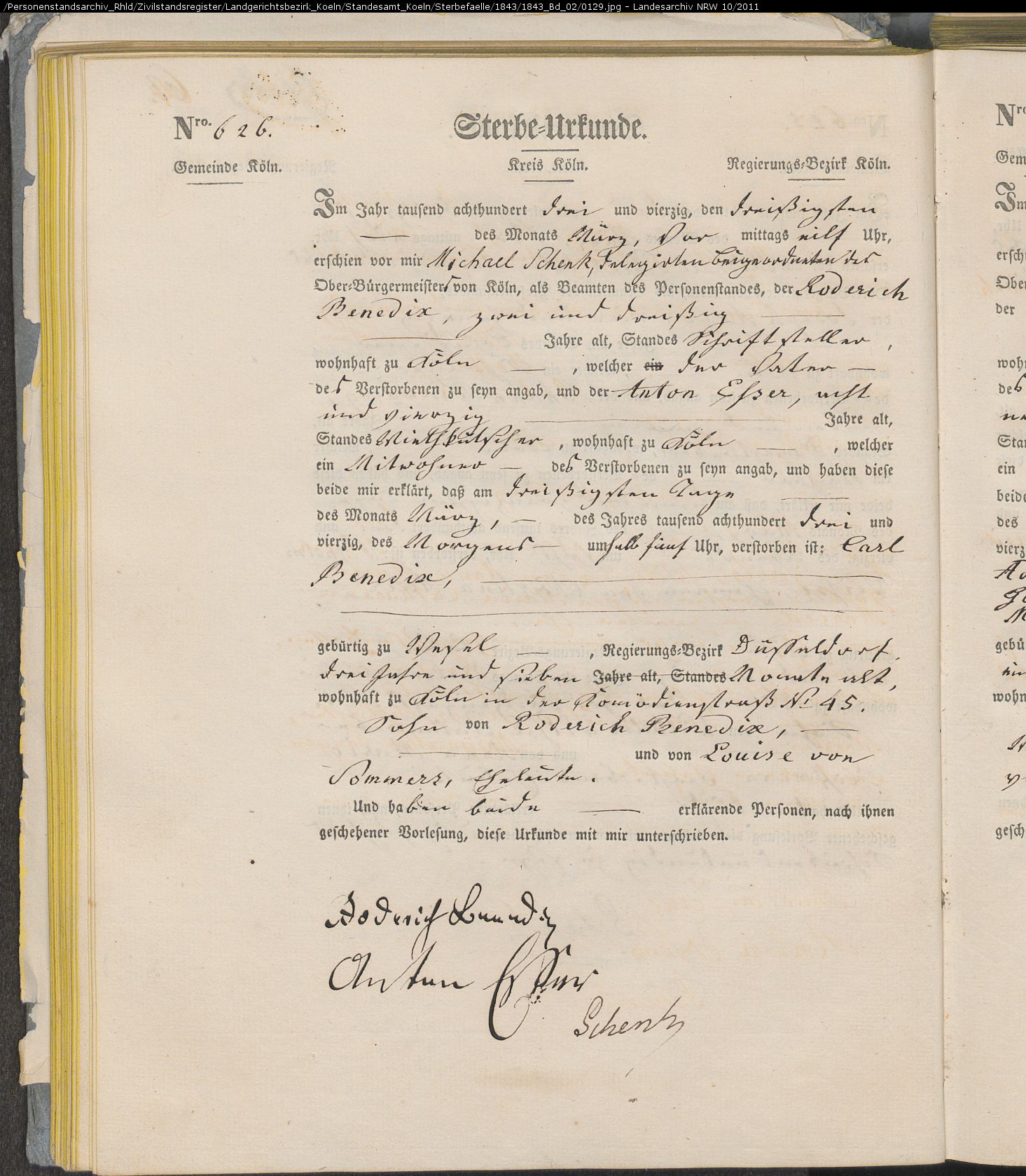 Köln Sterbeurkunden, page Land_1843_Bd_02_0129: Benedix Roderich () Köln Sterbeurkunden
