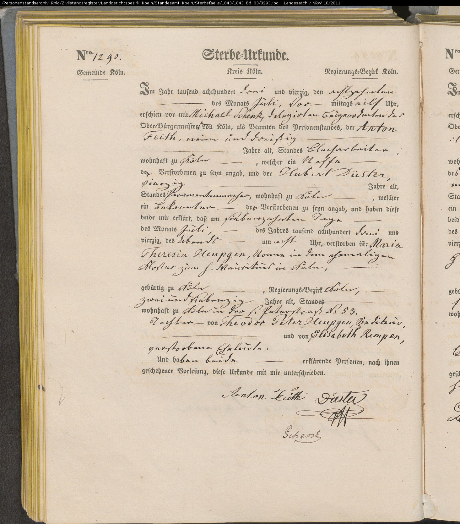 Köln Sterbeurkunden, page Land_1843_Bd_03_0293: Heupgen Maria Theresia (1290) Köln Sterbeurkunden