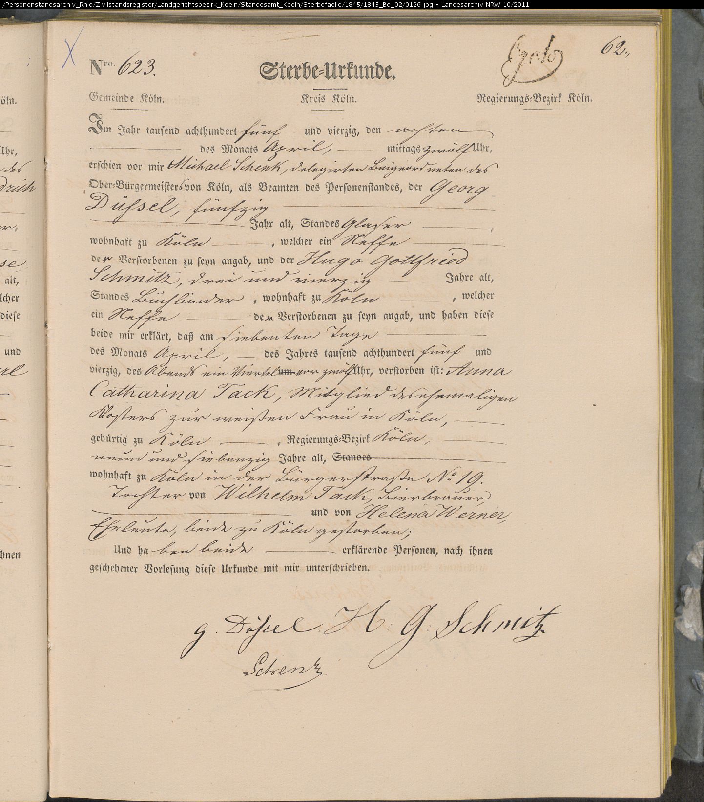 Köln Sterbeurkunden, page Land_1845_Bd_02_0126: Tack Anna Catharina (623) Köln Sterbeurkunden