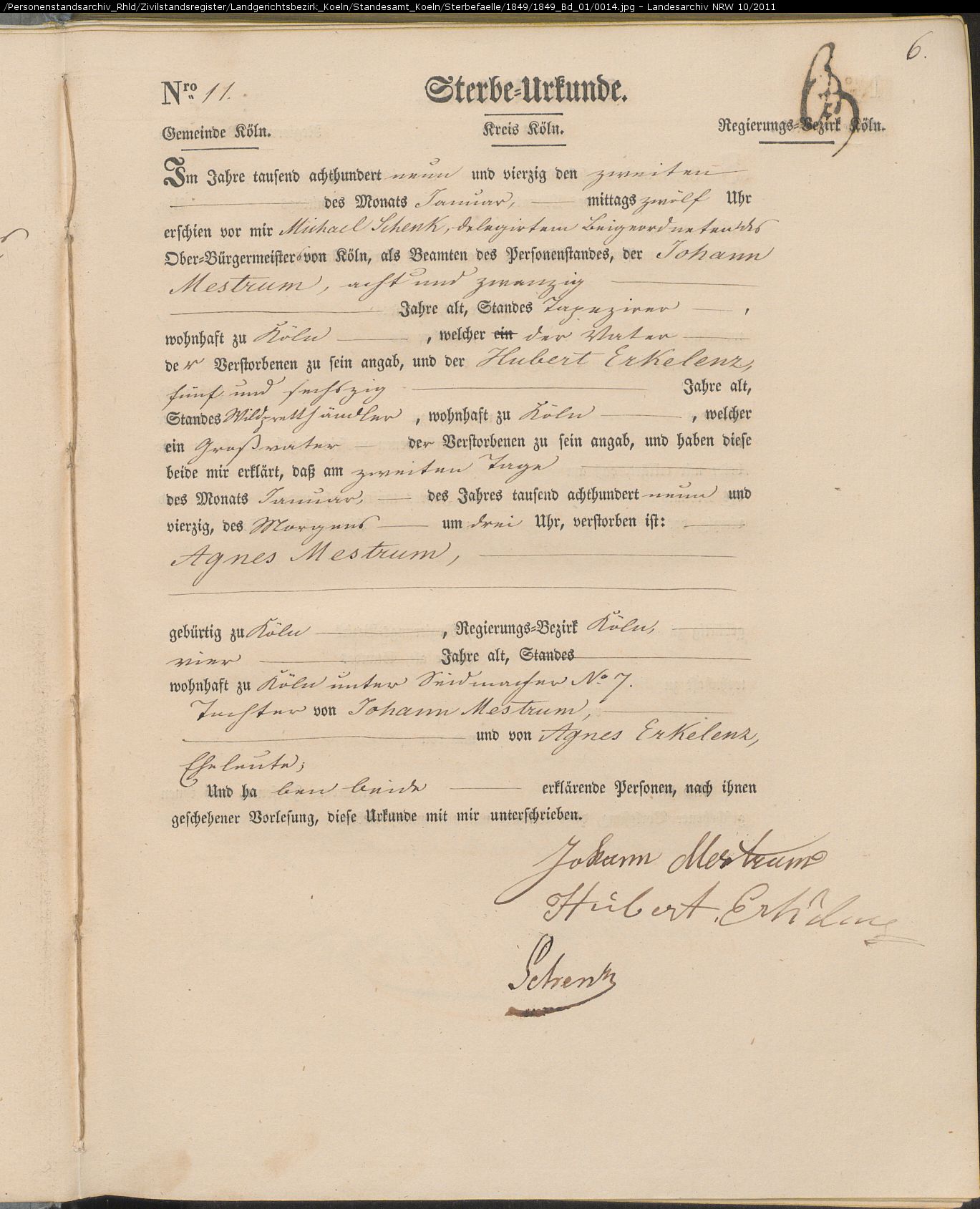 Köln Sterbeurkunden, page Land_1849_Bd_01_0014: Mestrum Agnes (11) Köln Sterbeurkunden