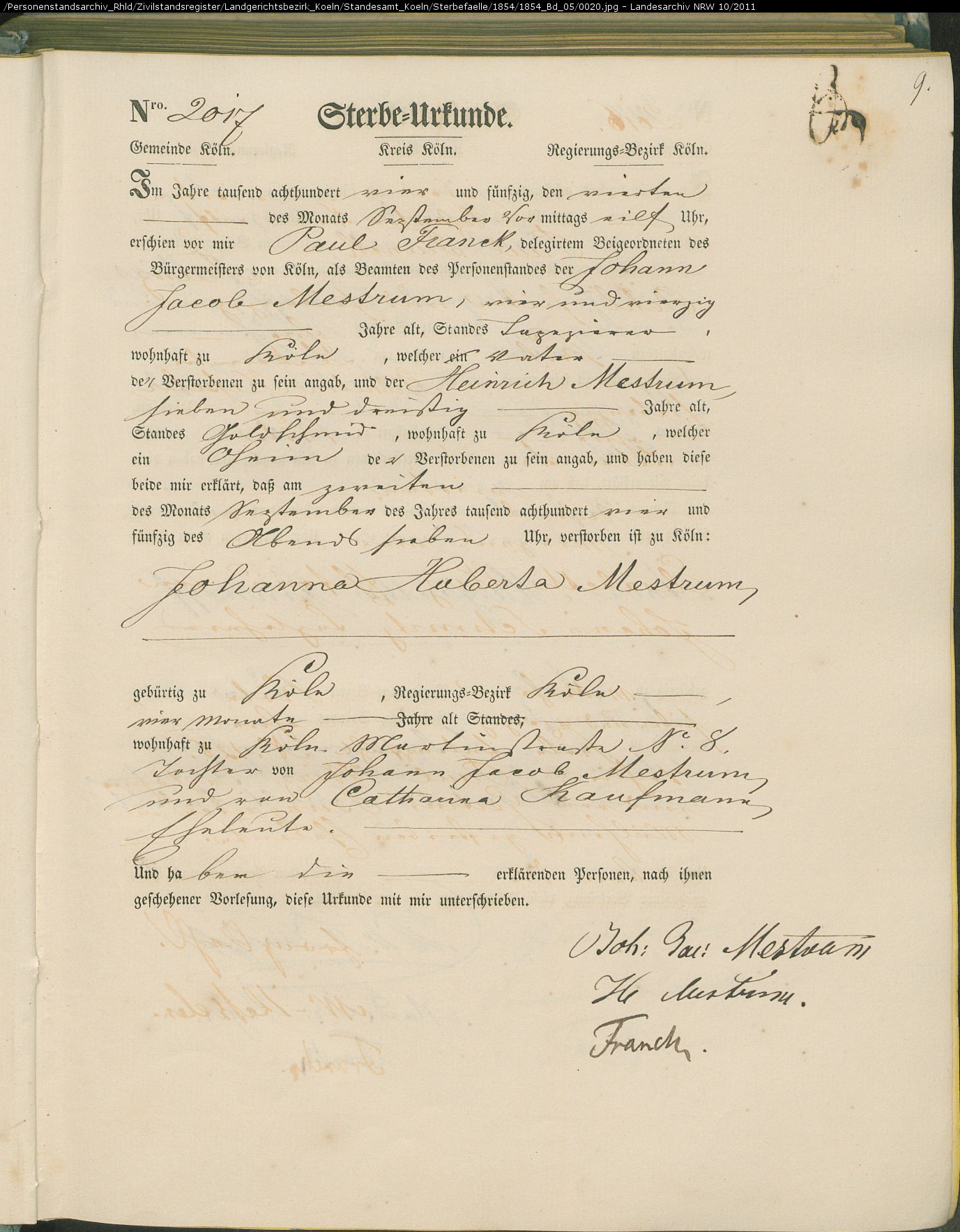 Köln Sterbeurkunden, page Land_1854_Bd_05_0020: Mestrum Johanna Huberta (2017) Köln Sterbeurkunden
