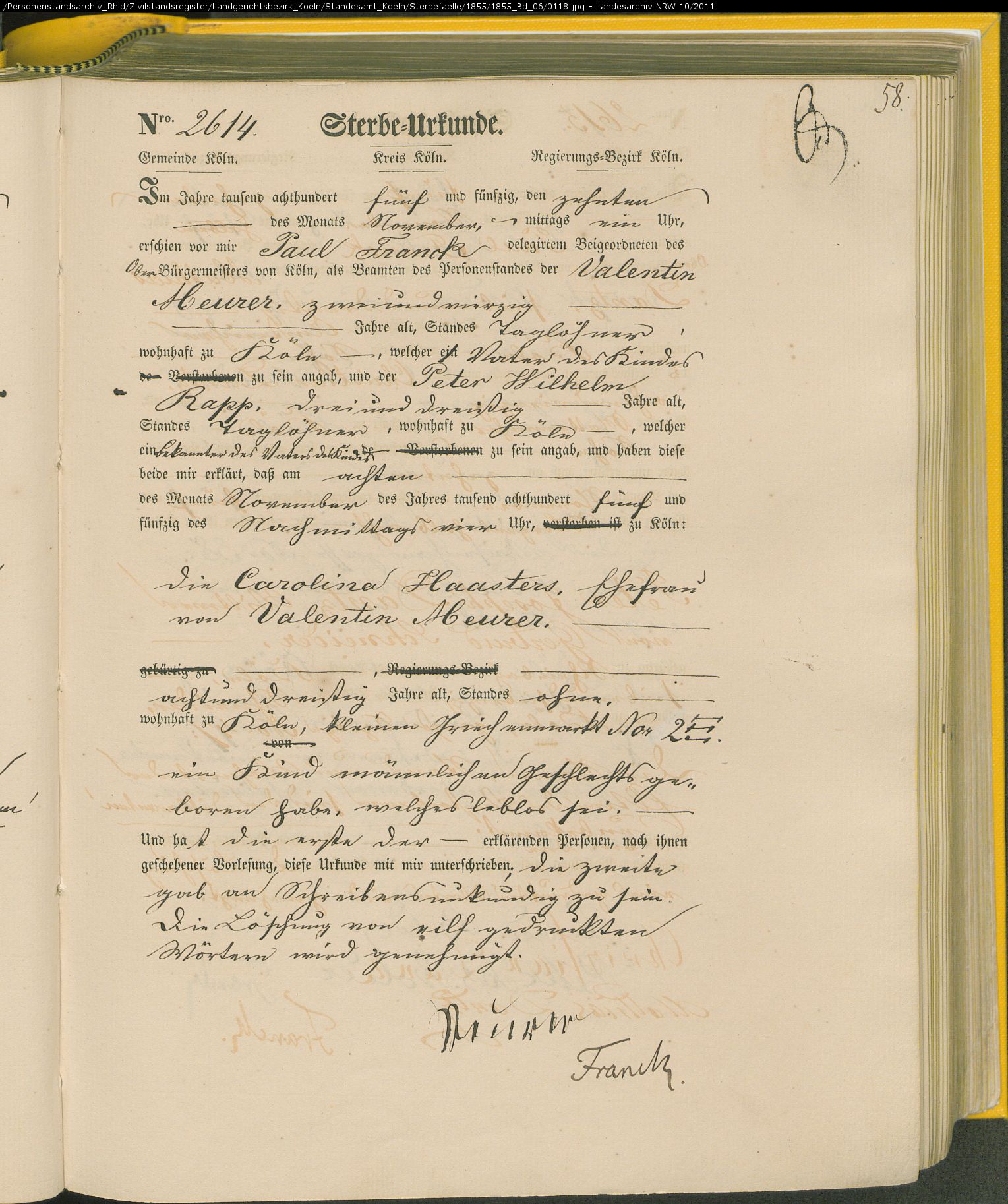 Köln Sterbeurkunden, page Land_1855_Bd_06_0118: Meurer geb. Haasters Carolina () Köln Sterbeurkunden