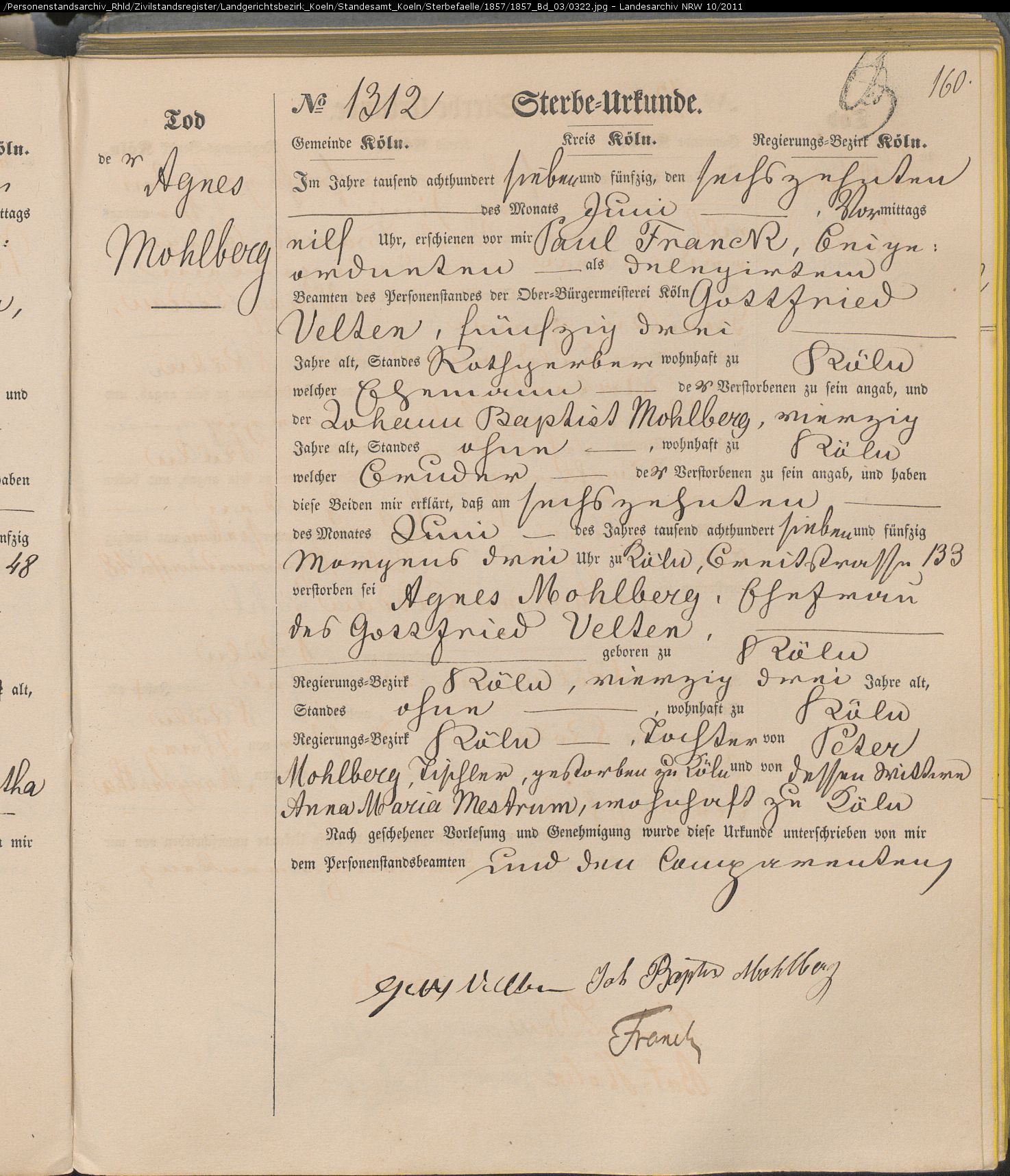 Köln Sterbeurkunden, page Land_1857_Bd_03_0322: Velten geb. Mohlberg Agnes (1312) Köln Sterbeurkunden