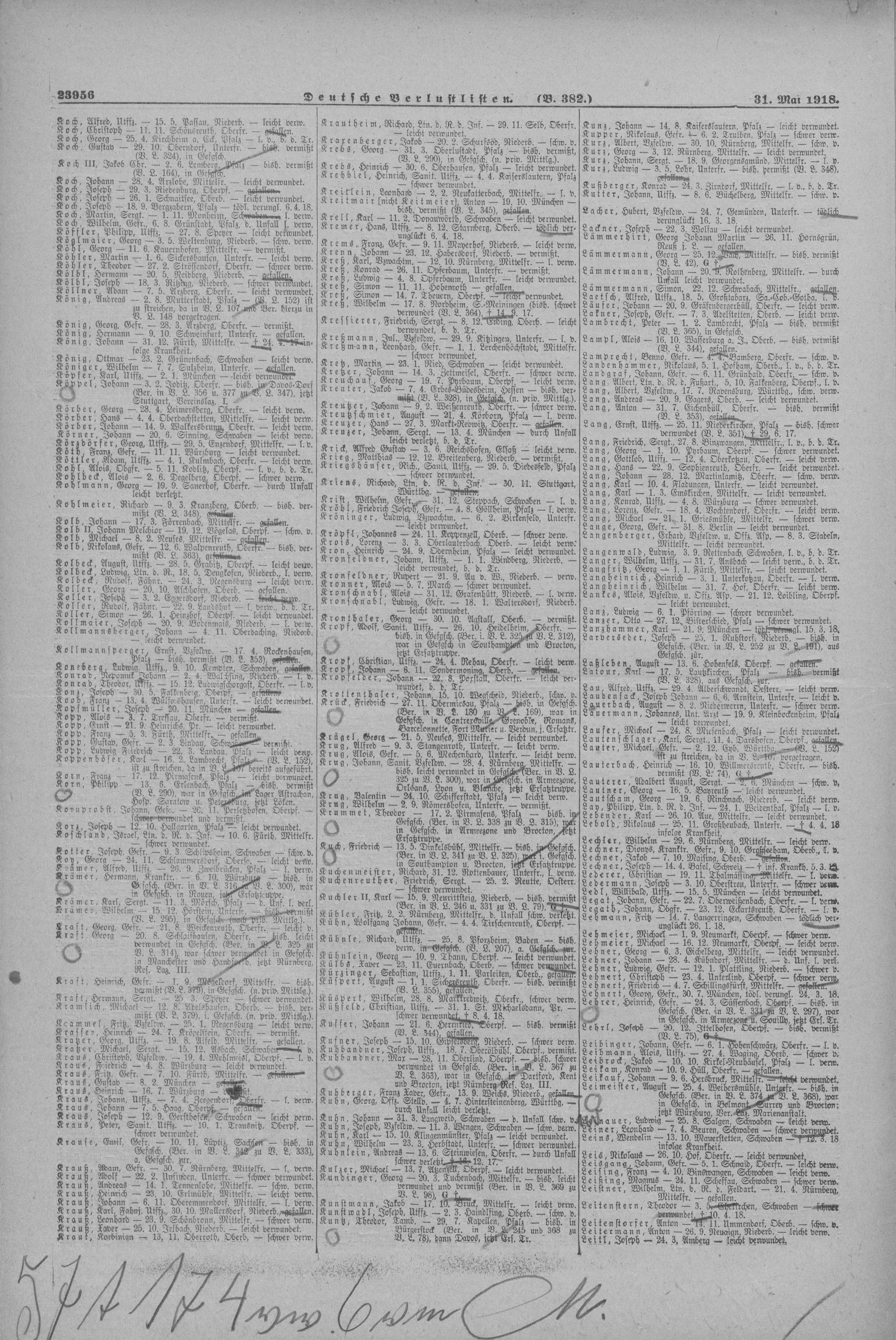 Verlustlisten 1. Weltkrieg, page 23956: Krehbiel Heinrich (Kaiserslautern, Pfalz)