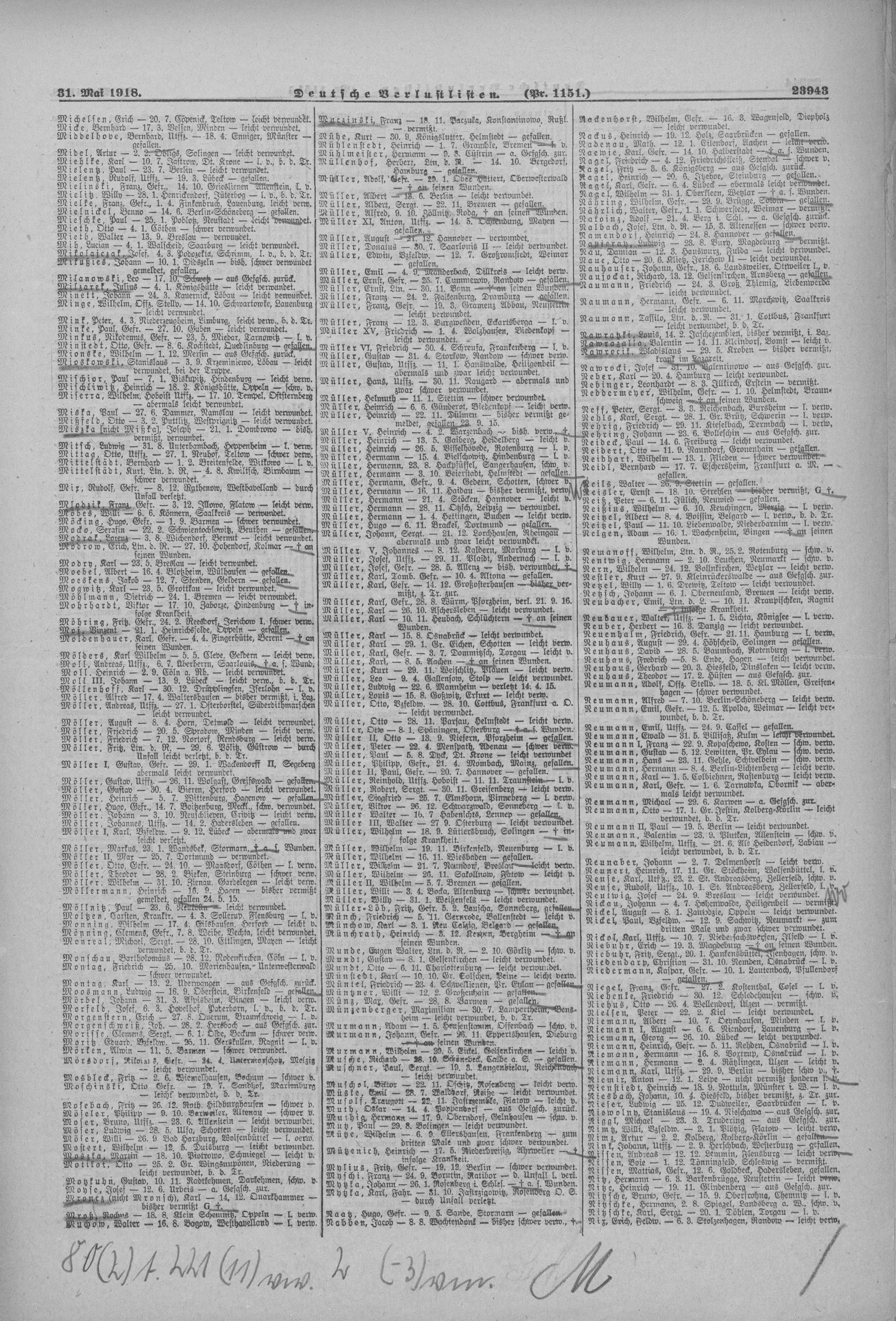 Verlustlisten 1. Weltkrieg, page 23943: Neubacher Emil (Kraupischken, Ragnit) Verlustlisten 1. Weltkrieg