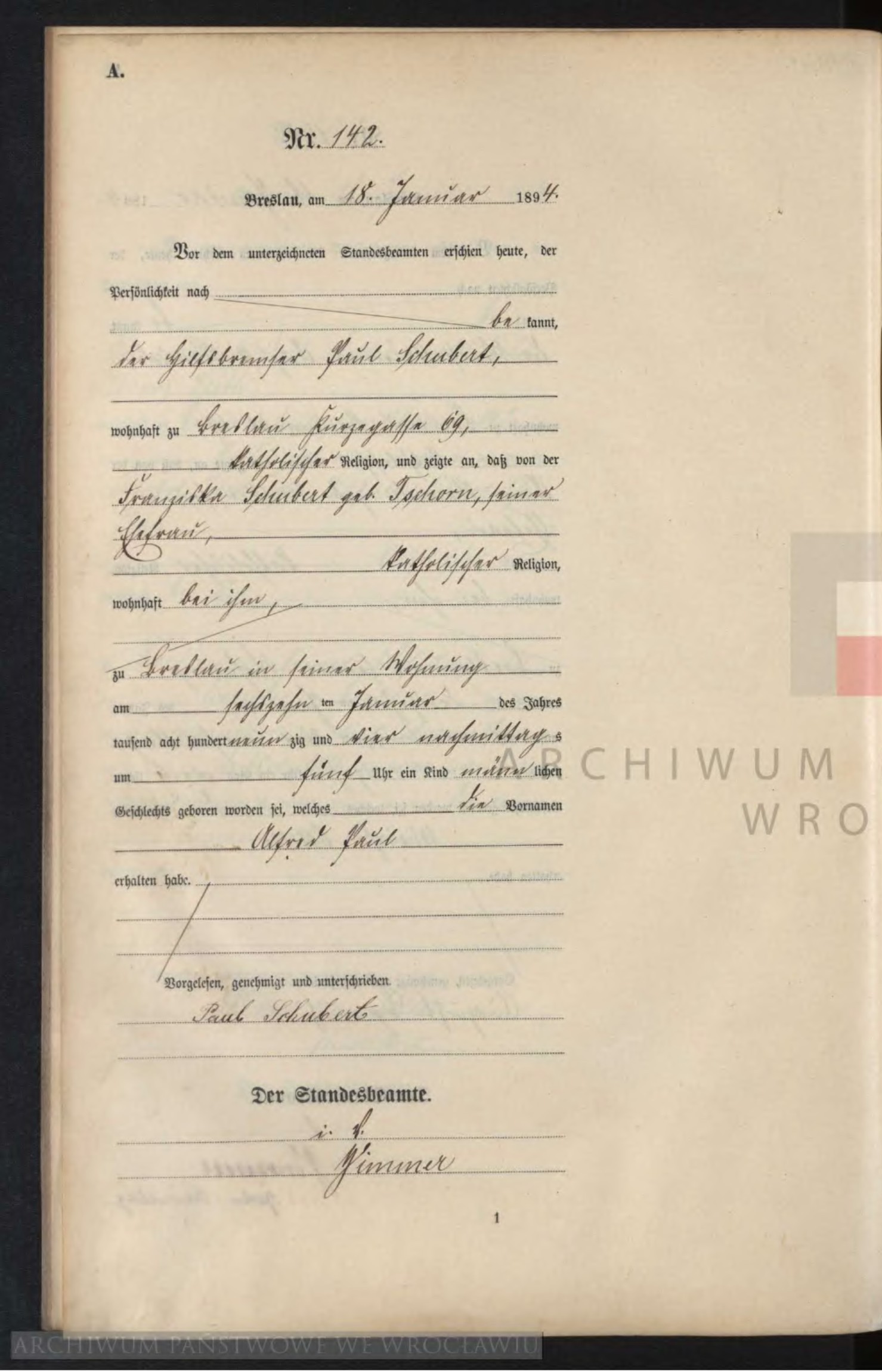 Breslau Standesamt Geburten, page 12885: Schubert geb. Tschorn Franziska () Breslau Standesamt Geburten